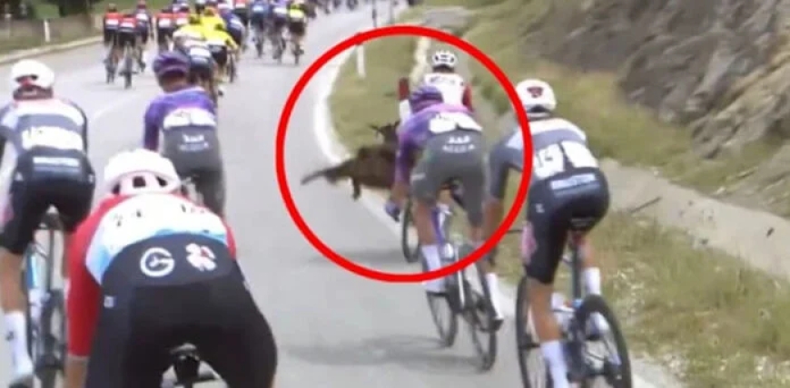 گیرو دی اٹالیا میں ریس کے دوران نیوزی لینڈ کے سائیکلسٹ سے بکری ٹکرا گئی اور یہ منظر کیمرے میں محفوظ ہوگیا۔